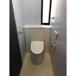 以前キッチンの工事をお任せ頂き、またご縁がありトイレリフォームのご相談を頂きました。 老朽化とスッキリした見た目で収納スペースが欲しいとご希望でしたので、TOTOのレストパルに新調しました。 施工前は収納するスペースが無かった清掃道具や配管が、キャビネットの中に隠れて見た目がスッキリとした印象になりました。便器もくびれが無いのでほこりが溜まりにくくお手入れが簡単になりました。 子供部屋の隣にあるトイレで、絵を描くことが好きなお子様が落書き出来るように壁紙の一部に黒板クロスを施工しました。 遊び心のある素敵なトイレ空間になりました。