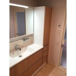 収納量を増やして温かみのある雰囲気にしたいとご相談頂きました。 施工前は間口1600cmと壁一面に鏡がある大きな洗面化粧台でした。そこで間口1200cmにして、サイドキャビネットを付け収納量を増やすご提案をしました。収納量を増やすだけでなく、キャビネット中の仕切りを細かくすることで、ボトルやタオルなど片付けやすく使い勝手が良くなりました。 温かみのある雰囲気にしたいとご希望でしたので、明るい木目調のメイプル柄を選定しました。 施主様から「洗面室がスッキリ片付いて嬉しい」とお喜び頂きました。