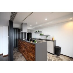 一部間取り変更を取り入れたフルリノベーションで対応させていただきました。 特にキッチン廻りにこだわり、既製品に意匠性の高い造作をほどこし、高級感あふれる仕上がりとなりました。