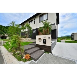 コンセプトは和モダンエクステリア。 京町屋の街並みをイメージしました。 シンボルツリーはコハウチワカエデ、 門塀裏の坪庭スペースはヤマモミジを配置。自然石を積み上げ、滋味深い空間に仕上げました。 植栽の成長と共に、趣きあるエクステリアになっていくのが楽しみです。 夜は各所にライトアップをしているので、光と緑の中を歩いていけるような動線を計画しました。 紅葉シーズンはとても風情ある違った空間になること間違いなしです。