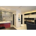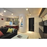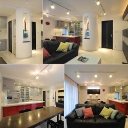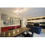 2008年 第16回 日本増改築産業協会ジェルコ 全国優秀賞 リビングダイニング部門 お客様のご要望は、キッチンが暗くて閉鎖的。内装がありきたりで古臭いので、今風の感じにして欲しいということでした。設計のポイントは、お客様は仕事でギターを使うので、『ロックミュージシャンの隠れ家』というテーマでデザイン。リビングに出っ張った柱が構造上外せなかったので、これにディスプレーとしての役割を持たせることに。建具と家具の色調を決めて、これにアクセントとなる赤をキッチンに設定しました。床壁天井を白で統一し、広がりをだす効果を狙っています。 リフォーム後のお客様の感想は、「以前の状況を知っている客が来ると反応が面白い。」「丸い筒もかっこいい。」とご好評です。壁面収納が散らかったものを効果的に収納丸い筒の立体感とリビングへ入った瞬間の演出に天井にビーム型ダウンライトを設置。間接とスポットの照明で空間演出に効果をもたらしました。リビング側から丸く見える円柱の裏側には、冷蔵庫を収めるようにしました。