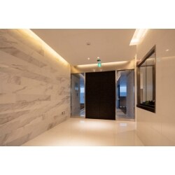 セキュリティを重視したオートロックの自動ドアを設置。内装は白で統一、壁の一面をアクセントに石目調のタイルを使用しました。