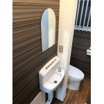 トイレ室が狭かったので、ドアを移設し、トイレ室外にあった手洗い場もトイレ室に入るプランをご提案をしました。トイレ便器は、男性が座ると、窮屈な状態でしたので、コンパクトなLIXIL『サティスSタイプリトイレ』をご提案しました。アクセントクロスの模様は、本来タテ縞模様ををヨコ縞にして、視覚的に広く見えるようにしました。広さも雰囲気もガラリと変わり、お客様には大変ご満足いただきました。 また、工事中に見つかった漏水にも対応しました。