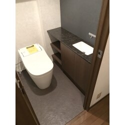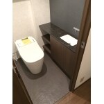 トイレは泡の力でしっかり洗浄するPanasonic『アラウーノSII』に。内装はダーク系で統一し、トイレルームがシックにまとまりました。 また、手洗いカウンター下の排水管が隠れるように、オーダー収納家具を設置しました。