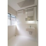 床も壁も白で統一して清潔感があり、光を反射する明るい洗面室となりました。