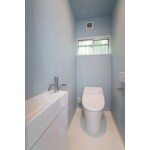 天井からの明かり取りで日中は電気を付けなくても明るいです。広々と使うために省スペースな洗面台と収納スペースを設置しました。