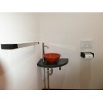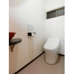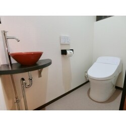 下地から木工・造作をやり直し、手洗はシンプルな洋風な内装にアクセントにもなる様朱色の陶器製のものを、黒塗りで仕上げた棚状のカウンターと併せて和モダンなイメージが映えるトイレルームになりました。