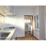 キッチンは、ダイニングテーブルが不要となったので、洗面室への出入りをスムーズにするために、冷蔵庫をダイニングテーブルのあった位置に移動させ、代わりに奥行きのとらないキッチンとそろいのカップボードを配置するレイアウトをご提案しました。 ガス炊飯器やポット等も、一か所にすっきりまとまるように、家電収納を設けることをおすすめしました。 洗面室は、床の劣化が進んでいましたので一部補強を行い、キッチンとの続きになるため、同じような木目の、水に強いクッションフロアー貼りを、洗面化粧台は、髪のお手入れ等に便利で、小物類もすっきり収納できる三面鏡をご提案しました。 また、日ごろ気になっておられたという玄関や、和室も、今回の工事と並行して工事を進めることで、お値打ちに改装させて頂きました。