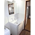 洗面化粧台で洗髪できると便利なため、シングルレバーのシャワー水栓と、小物類もしっかりと収納できる三面鏡へのお取替えをご提案しました。 床の下地補強を行い、仕上げ材は水に強いクッションフロアーに、洗濯機用の給水配管が露出していたため、壁の改装もおすすめし、壁内に隠蔽してすっきりとさせました。