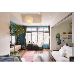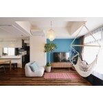 施工後の様子です。 TVスペースと窓の壁にはターコイズブルーのアクセントクロスを貼っています。リビングからもダイニング・キッチンの様子を感じることが出来ます。
