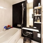 シックなカラーのアクセントパネルで落ち着いた印象のバスルーム