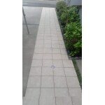 道路から玄関までのアプローチはタイル貼りです。ソーラー蓄電タイプの埋め込み照明を取り付けて、日が落ちると優しい明りで玄関までエスコートしてくれます。 ガレージ部分はアクセントに小舗石でラインを入れました。車2台分の大型カーポートを設置し、折り畳み式の物干しも取り付けました。