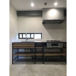 お施主さまは天然素材がお好きで化石を集めるのがご趣味とお伺いしていたので、壁面には化石を含んだ天然石をご提案しました。 キッチンは温かい雰囲気の天然木と黒いフレームを組み合わせたWOODONEのフレームキッチン『KUROMUKU』をセレクト。 シンプルながら存在感のある、男前なキッチン感を演出しました。 お客様の好きを随所に取り込むことができたと思います。