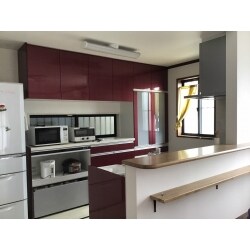 稼動式の吊戸棚が、使いづらい。キッチンは対面式にして 収納を増やしたい。