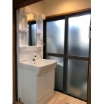 (旧京都建物株式会社(京都建物工務店リフォーム)での事例です。)洗面台の交換、床の張替え、壁と天井の壁紙を貼替えました。照明が無く暗かったためダウンライトを取付けました。
