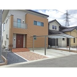 建物との統一感とシンプルで使いやすい駐車場を考えご提案しました。 駐車スペース2台分にはカーポートを設置。 カーポートを設置しておけば、北側でも寒い冬場にフロントガラスが霜でびっしりということもありません。