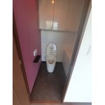 リビング側のトイレ。収納は十分。ありますので、便器の交換と、クロス、クッションフロアの貼り替えを行います。