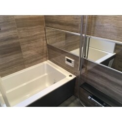 シックなデザインのアクセントパネルで、高級感の漂うバスルームになりました。 追い炊き機能や水はけの良い床など、機能性がUPしました。