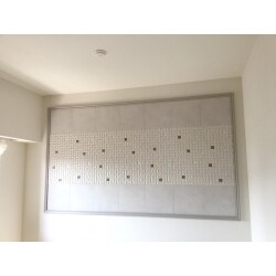 壁一面の大きなエコカラットを設置し、おしゃれな寝室になりました。さらに、湿度を調整したり、気になるにおいを脱臭してくれるので、心地よいスペースになりました。 また、リビングの壁クロスの一部張替えもしています。