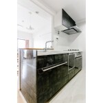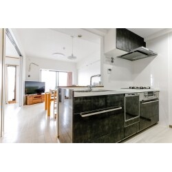 高級感のあるホテルライクな空間をご希望でしたので、キッチンも以前と同じブラックですが、さらに高級感のある黒・グレーのマーブル調の柄で設置しました。全体的に白いフローリングにして解放感のある空間となりました。