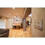 子育てがしやすい様にと間取りを見直して配慮したのは、奥さまがキッチンにいてもお子さまを見守りやすい状態である事。奥まったところにある壁付I型キッチンをL型の対面キッチンに替え、リビングダイニング側を開放。一部に壁と窓を設け、中が見えすぎないよう配慮し通風を確保しました。南面の2室をつなげて広いリビングダイニングを造り、上階の配管が走る天井は組みなおして防音性と断熱性を向上。壁は漆喰に、床は天然塗料で仕上げた無垢材で造り、お子さまものびのび遊べる心地よい空間としました。
