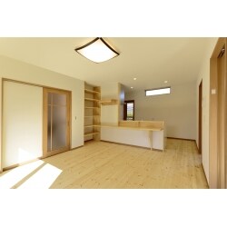 木のぬくもりが感じられるよう、床材に肌触りの良い無垢材を使用。造作棚は集成材を使用し、あたたみのある雰囲気に仕上げています。