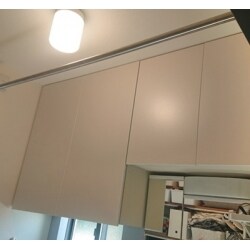 高さや幅のバリエーションが豊富なキッチン用の吊戸棚を組み合わせて、ほぼ隙間なく空きスペースを活用。窓よりも収納力優先とのことで、クレセントに影響しない程度の高さまで棚を配置しました。突っ張り棒は着脱可能なステンレスハンガーパイプに取替。