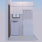 (1)洗濯機と洗面化粧台の上方に棚を設置 (2)ハンガーパイプ (3)浴室入口手前の壁面収納造作 の3点を組み合わせてご提示しました。この内で(1)(2)の設置となりました。