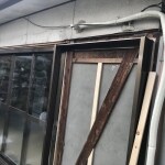 木製のサッシと雨戸を職人と一緒に事前確認。葡萄棚は撤去していただきました。