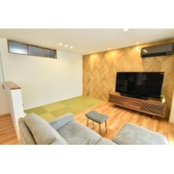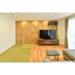 北欧テイストに仕上げるためにヘリンボーンの壁材をアクセントにし、自然な中にも北欧らしいインパクトのある空間になるようご提案しました。 こたつを置いても違和感なく寛げるような北欧テイストにも馴染むオープンな畳スペースを設けたり、リビングの空間を広げる為キッチンを対面に、全体の色のバランスにも気を配り、まとまりのある空間を創りました。 建具やタイル・家具・照明・すべての大きさや色の比重までも考え心地良い空間になりました。