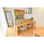 明るい空間にしたいとのご要望でしたので、キッチンはオープンにしました。キッチンカウンターの背面にはお気に入りのタイルを張り、出入り口の無垢のドアとのコントラストを合わせています。 照明とのバランスも考え、カフェ風にお茶を楽しめる空間になり、お客様にも大変喜んで頂きました。