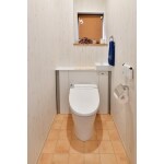 別空間のトイレは白を基調にシンプルにまとめました。床材がアクセントになり、シンプルな北欧テイストに。 収納の確保の為にリフォレを設置し、お手入れもしやすく、スッキリとした清潔なトイレ空間になりました。