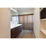 LIXILのMVをご提案しました。 化粧台のサイズアップ、ミラーも1面鏡から3面鏡にしたことで収納量が格段にアップしました。背面にも収納棚を設置し、使い勝手が良くなりました。 浴室、洗面脱衣室の雰囲気の一体感と、採風・採光を考慮し窓はバーチカルブラインドに。洗面のデザインがより空間を引き立ててくれています。
