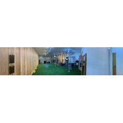 オーダーメイドのウンテイに人工芝の組み合わせで建物の中にいながら外にいるような感じにしました。奥の棚は施主様のご希望をお伺いしながら造作し、マットを収納したり、ちょっとしたジム用品を収納できるようにしました。大工さんのオリジナルです。