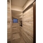 ・洗面室全体 とてもスタイリッシュな印象の洗面化粧台、PanasonicのClineをチョイス。本体のダークブラウンパネルに対してクロスやフロアタイルは淡い色合いのものを採用し、コントラストを出しました。 ・収納 スタイリッシュさと相反する「収納」ですが、壁厚収納(壁に埋め込むタイプ)でスタイルを崩さずに収納容量をアップしました。 Clineのスタイルはそのままに、見た目もスッキリです。
