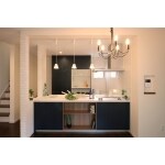 ダークネイビーとホワイトで高級感のある雰囲気に。 システムキッチン本体がリビングを飾る上質な建具として機能するように仕上げました。