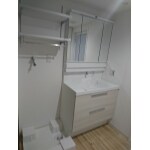 オール引き出し収納、三面鏡の洗面化粧台。壁付水栓でボウルが広く使えます。洗濯機スペース上部には可動棚とパイプハンガーを設置。