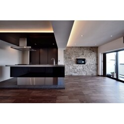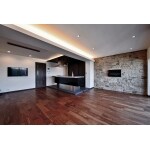 以前の間取りは、この開放的な空間に対して居室とクローゼットがあり、さらに奥に進むと居室が3つありました。どちらの空間もスケルトンにして、LDKは17帖の大きな空間に変わり、奥の部屋はシアタールームと和室に変わり今までの空間とはガラリと印象を変えました。 キッチンは配水の関係で床が上がっていますが、これを逆手に取り開放的な空間に対して、床でリビングと差別化をしています。ステージ上で料理しているような感覚になり、今までより料理をすることが特別な時間に感じていただけるでしょう。また、天井も配管の兼ね合いでリビングと比べると一部下がっています。こちらは、あえて下がっている部分のみにアクセントクロスを貼ることで、よりキッチンがリビング空間の中で目立ち、キッチンがメインの空間となります。