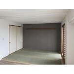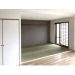 リビング横の和室の間仕切りと建具を撤去し、開放的にお使い頂けるようにしました。アクセントクロスや縁のないすっきりとしたデザインの琉球畳を採用しました。
