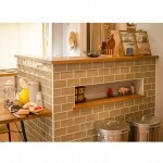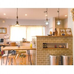 高さのあるキッチンカウンターには、グリーンのタイルを貼り、ノスタルジックな雰囲気。ニッチ棚に、お気に入りの雑貨を飾れます。ウッドのダイニングテーブルやナチュラルテイストとも相性抜群で、まるで雑貨屋さんのような雰囲気です。