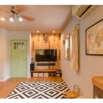弊社のリノベーションモデルハウスの内装を気に入っていただき、建具や床材は同じものを使用することに。 プレーリーホームズのオーク合板床材は、自然の風合いを感じさせる木目。テレビ側のアクセント壁とも良く合います。 アウトドア好きの男性陣に似合うリビングは、西海岸のようなメンズライクな印象で、アースカラーのインテリアとも調和します。 優しい若草色のドアは、玄関からLDKまでの雰囲気にも合い、床材とともに統一感を高めます。 LDK全体の甘辛ミックスのさじ加減がちょうど良く、S様ファミリーらしい住まいになりました。
