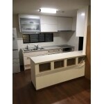 L社のシステムキッチンの中でも上位グレードのリシェルを設置致しました。自動で下りてくるウォールキャビネットは物が取りやすく、側面には収納・作業スペースが存分にある収納フロアをドンと設置しました。 また、リビングとの仕切りを作り直し、開放的な空間に生まれ変わりました。