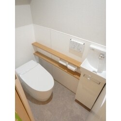 タンクレストイレにしたので、スペースが広くなりました。吊戸棚を増設し、小物を置ける棚を設置し、使いやすいトイレになりました。 腰壁に設置したパネルは、汚れてもすぐにふき取れるので、キレイを保てます!