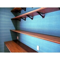 ちょっとした書き物ができるデスクコーナーに。カウンター上に書籍や小物を並べられるよう壁面を補強し、オープン棚を施工しました。