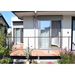 ウチ・ソトの出入りを考えウッドデッキをご提案。 外廊下の様なデッキスペースでご主人のお部屋と奥様のお部屋をつなぎ、さらに玄関ともつながる動線を確保しました。 また当初は「一階のお部屋からアクセスよくお布団を干せるようにしたい」との要望がありました。 そこでデッキスペースにはシンプルなラインの手すりを取り付け、プラスアルファでデッキを使った動線提案をしました。