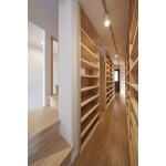 家の中心が書庫スペースのため、書庫からもそれ以外の場所からでも2階へ行けるよう、二方向から使用できる階段を設置しました。通路幅が狭いため、一番下の階段は使わないときは収納できるように工夫しました。