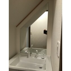 鏡は大きいほうが見やすく、また空間を広く感じられるので、天井の傾斜に合わせて鏡を斜めにカットしました。限られたスペースを活かしつつ、今のおうちに馴染むようなご提案をさせていただきます。また、ロールスクリーンはO様にお選び頂き、交換をしました。