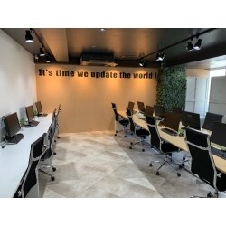 お話を伺いましたところ、こちらの壁面には社員の皆様が手書きでメッセージなどを描かれるとのこと。 また、天井をチャコールグレーに塗装することで、以前よりもスマートな印象へと変わりました。既存ともマッチしており、天井が濃いカラーでも重く感じず、気持ちも上がるおしゃれで明るいオフィスに仕上がりました。