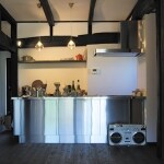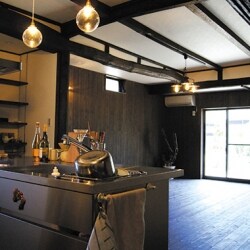 洋室の壁を取り払い、広々としたLDKに間取り変更。こだわりの道具を飾りながら収納して、キッチンに色彩とリズムが生まれます。 まるい照明の輝きがステンレスキッチンに反射し、古民家に現代の輝きをもたらします。