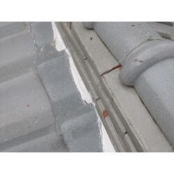 【施工前】 漆喰がボロボロに剥がれ落ち、中の盛土も崩れかけていました。 そのため、棟も歪んでいたようです。 また、台風で物が飛んで来て当たったのか、一部の瓦に穴が開いていました。